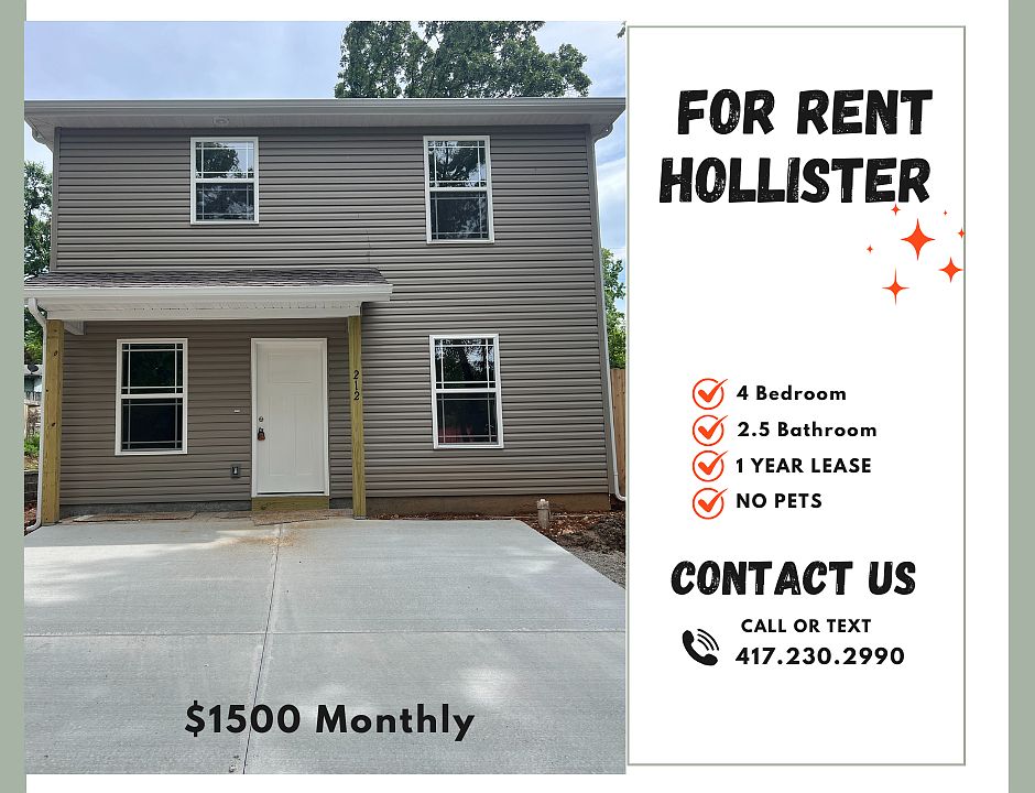 Brand new construction home in Hollister, MO. Primary suite downstairs along with kitchen, dining room, living room and half bath. Upstairs you'll find three bedrooms, bathroom and laundry. Minutes to all Hollister's restaurants and shopping along with Branson Landing. Tenant is responsible for electric, water, sewer, trash, Internet services, and lawn maintenance.