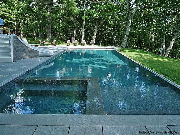 Privacy and serenity are yours at this significant, architect-designed modern residence on over 9 coveted Woodstock acres. A long paved drive leads to this spectacular 4 bedroom home, with panoramic views of the mountains, reservoir and Hudson River. The dramatic vaulted and beamed great room with two-story fireplace is the heart of the home, with walls of windows overlooking the view. Gracious stone patios and paths lead to the stunning vanishing edge, gunite in-ground pool. This pool is unlike anything else in the area, with a retractable cover, integrated spa, granite surround and custom pebble finish. This property has everything you need for the best of country living. The lovingly maintained and upgraded residence features a ground floor master suite with custom closets, a stunning bath with the finest finishes, and the sound of the waterfall garden outside the window. A spacious, additional family room off the kitchen is perfect for casual gatherings. The custom gourmet kitchen has the finest appliances, a large work island, and separate wet bar with wine cooler. The open floor plan flows from the kitchen to the great room, with views from every angle. The screened porch off the kitchen is perfect for lounging or dining. Ascend the sweeping, modernist staircase to the second level, with a dramatic hallway overlooking the great room, and 3 additional bedrooms with en-suite baths. Walk up to the meditation tower and be rewarded with panoramic views by day and a blanket of stars on a clear night. There's an additional bedroom and full bath in the attached guest room, which is also great for an office space. This is arguably the finest home on the market right now, moments from the center of Woodstock and offering every amenity to guarantee your safety and comfort, including a stand-by generator, central air and two-car garage. Partially fenced areas are great for pets, and there's plenty of room for a tennis court or playing field. The property also features many level areas, unique among mountain homes, and is adjacent to over a thousand acres of forever wild state land. Enjoy all that Woodstock has to offer from the comfort of your mountain retreat.