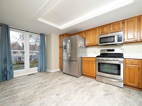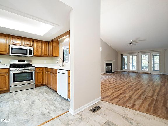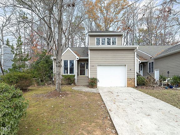 Can be shown for backup offers. End Unit Townhome with first-floor primary bedroom in Kildaire Farm area! Lives like a ranch downstairs! Primary bedroom has view of private wooded common area. Primary suite features walk-in closet, soaking tub, door to porch. Two large bedrooms and a full bath upstairs! Just updated with new interior paint, new LVP flooring downstairs, lighting. Two upstairs bedrooms have lovely new neutral carpeting. Bathrooms feature tile floors. First floor HVAC new in 2023. Roof new in 2022. Spacious kitchen features 5-burner gas range, dishwasher, disposal, pantry. Home backs to wooded common area so you can enjoy your screened porch and yard with privacy. Attached garage for added bonus! Enjoy maintenance-free living w/ Chimney Rise HOA providing exterior maintenance and landscaping. Quiet neighborhood centrally located just off Cary Parkway and Lake Pine Drive just minutes from shopping, dining, parks, medical care and more. Refrigerator, washer and dryer remain in as-is condition. HOA managed by HRW and Kildaire Farms II. Connections for electric or gas range in kitchen. Also for electric or gas dryer. **Tax record says 1825 sq ft. Profess. measurement 1779 sq ft. Sketch included in MLS documents.
