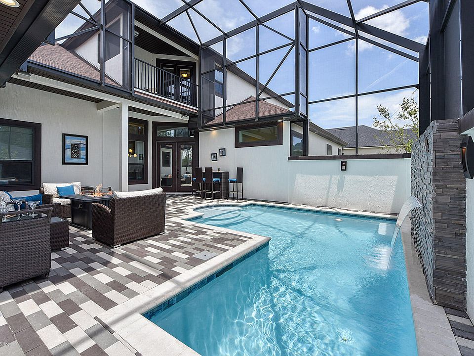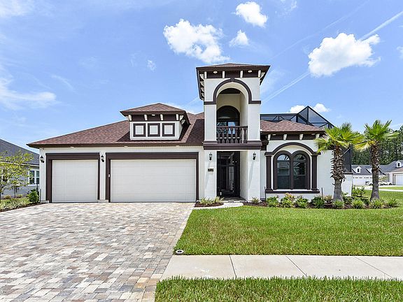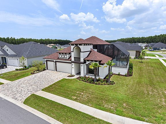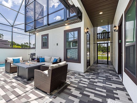 Beautifully designed custom Mediterranean home shows like a model & sits on a large lake view corner lot. Enter through gated entry into private courtyard pool w/ LED waterfall & pool house w/ full bath. Walk through French doors for an immaculate open view of living, dining & kitchen under a white beam coffered ceiling. Gourmet kitchen features a lge granite bar, dbl ovens, farm house sink & Hampton white cabinetry w/ stone to ceiling. Mstr. bdrm has sitting area, spa styled tiled bth rm w/ glass to ceiling shower & free-standing tub. Upstairs, enjoy the game rm & watch a movie behind hidden custom wall/doors in media rm w/ wet bar on the 120-inch screen. Or sit outside on the balcony overlooking the courtyard. This home is designed for yr-round enjoyment w/ surround sound throughout