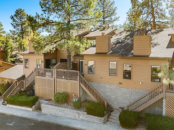 Enjoy being in the pines and views, walking distance, 1.3 miles to downtown, featuring dwelling ins. included in HOA. 3 bedrooms (2 primary, 1 has slider to front deck, other two upstairs with views) 2 Full bathrooms, Enter to vaulted ceilings, an inviting fireplace, plantation shutters throughout, a shining kitchen for entertaining and front and out door views as well as the fireplace, living and dining area. The kitchen has newer countertops, stainless steel appliances. Love the covered back patio with ground level access, gardening rights and forest views and periodic forest visitors. The Font patio boasts mountain and views and overlooks the community pool with community room access. Walking distance to all that you can need. Dont miss this one