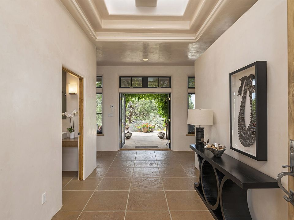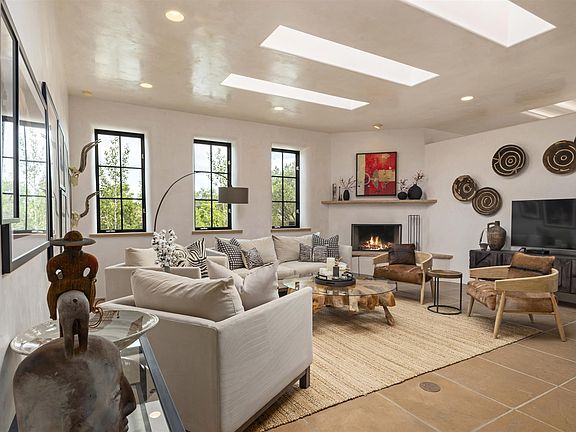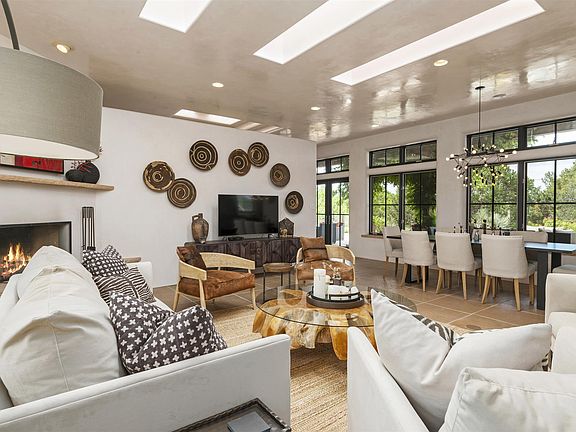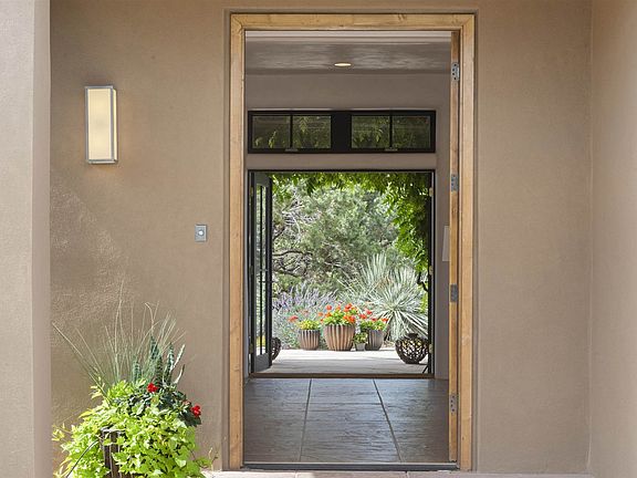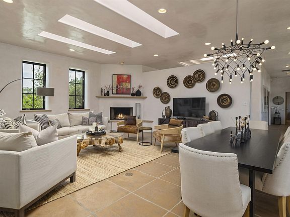 The best of contemporary Pueblo Revival architectural style is conveyed in the sleek, clean and dramatic lines and workmanship of this home. Neutrally colored concrete tile floors, rows of picture windows and numerous dramatic skylight treatments create an atmosphere of light and space while contrasting black accents framing the windows and defining cabinetry, lend drama and sophistication to the narrative. A wall of windows with clerestory windows line the central living corridor and give view to a recently renovated portal set amidst a lush and professionally designed gardenscape. An elegant master suite has access to the portal and a smartly designed bath with soaking tub, glass-paned shower, separate commode and two vanities. The guest room has a full bath and window to the the north-facing front yard views. The third bedroom, currently set up as a 500 ft studio, is equipped with ample storage hidden by attractive sliding floor-to-ceiling closet doors and houses a ¾ bath. The open-concept kitchen features a large kitchen island with granite countertops, stainless steel appliances, slate-gray wood and glass-paned cabinetry. Set on a little over an acre and fenced on all sides with a gated entrance, this home has been sited to enjoy sunset views and maintain its privacy in spite of its great convenience to all the local amenities. In-floor radiant heat as well as refrigerated air conditioning and evaporative cooling.