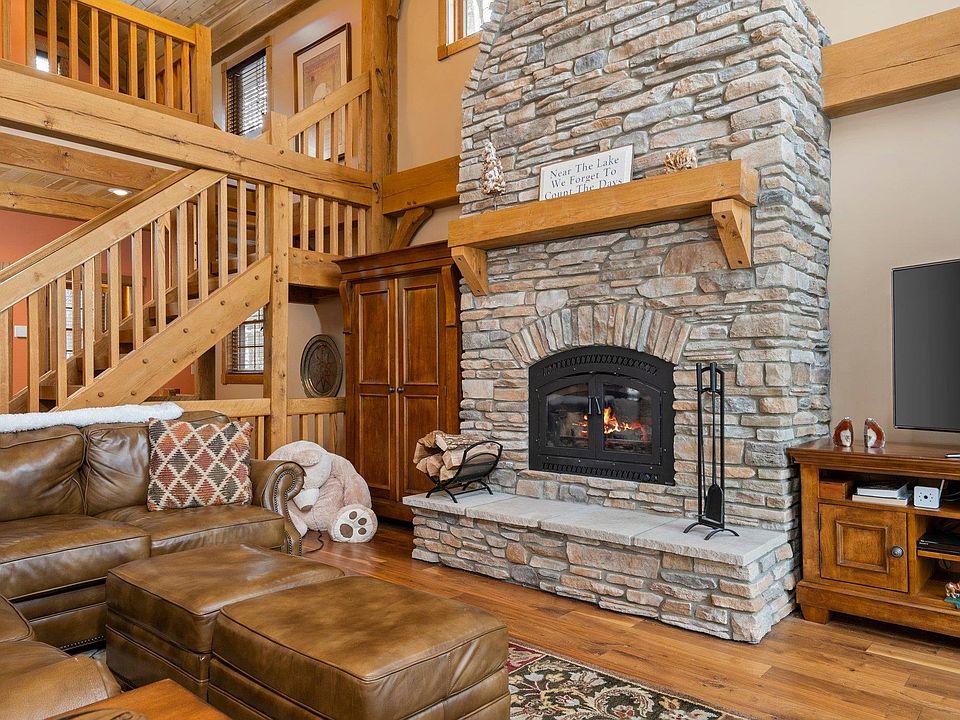 Sunrise Heights Association property on Higgins Lake with private boat slip. True timber framed house with solid white oak and classic craftsmanship using traditional and enduring mortise and tenon joinery. Focal point, floor-to-ceiling brick fireplace. Hand-scraped black-walnut floors. Composite, wrap-around deck for abundant outside use. Bathroom on each floor. Granite kitchen counter tops with soft-close cabinetry.