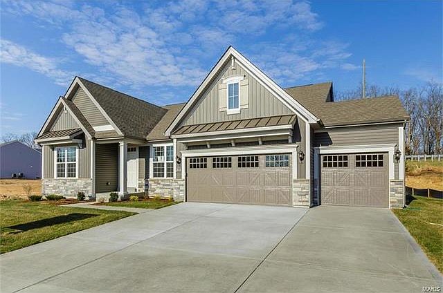 NEW CONSTRUCTION by Payne Family Homes in the gorgeous Willow Walk Estates neighborhood! Enjoy the peaceful setting and rolling terrain in this desirable, single entrance community. This 3 bedroom, 2.5 bath, 2,161 square foot ranch has a 4 car garage (4th car is a tandem)! The front elevation has stone, vinyl siding, architectural shingles, garage coach lights, professional landscape and a fully sodded yard. Features include 12 foot ceilings in the Great Room-Kitchen-Café, gas fireplace with stone surround, Den with French doors, transom windows in the Great Room, Café & Master Bedroom, Deluxe Kitchen, staggered height cabinets with crown, cabinet hardware, built in appliances, stainless steel appliances, double oven, roll out trays, granite countertops, coffee bar, gas cooktop, walk in pantry, laminate wood flooring, 5.25 base trim, a HUGE Master walk in closet, humidifier, custom wall color, rough in bath, 16 x 12 exposed aggregate patio, garage door opener, wireless keypad, a garage service door and more. This sought after community is located just minutes from shopping, dining, schools, recreation, parks, Busch Wildlife and has easy access to Highways 364, 40 and Chesterfield Valley. This home is under construction and scheduled for a Mar 2017 completion.