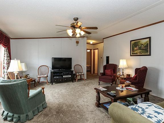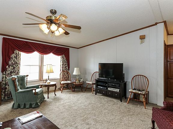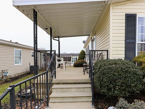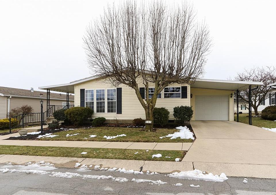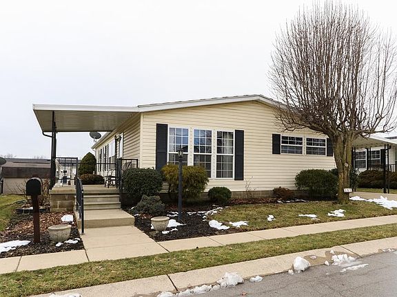 Nice 3 bedroom, 2 full bathroom Palm Harbor home in South Point Village a 55 and older retirement communityin Fairborn. Present owner installed new carpet in May 2018. Open concept living, dining room with breakfast bar with overhead cabinet for those nice collectibles or china. Large windows in living and dining room allow loads of natural light to filter in making for a warm, cozy atmosphere. Attached 12x24 garage, 12x20 covered rear patio, storage shed and covered front porch.