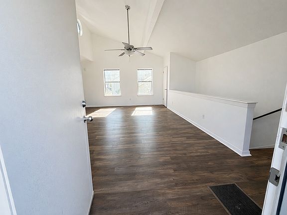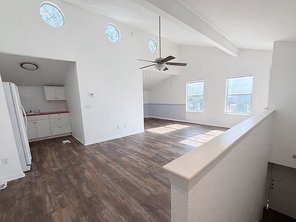 Step into a bright, airy home with soaring vaulted ceilings and an open-concept layout that feels spacious and inviting. Natural light pours in through large windows and striking round stained-glass accents, highlighting the warm wood-style flooring and fresh, clean interior.