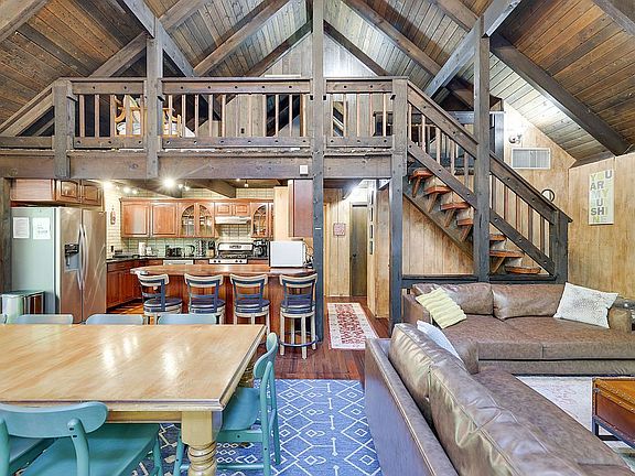 Spacious A-Frame Lodge home located in the 5-star Platinum all amenity community of Lake Naomi. This impressive property features 5 bedrooms, 2 baths, hardwood floors, cathedral & vaulted ceilings with woo drafters, and central air. Lower level encompasses a family/game room, utility & laundry room, lg capacity water heater, 2 bedrooms and full bath. Main level showcases an open concept living room with tall windows for plenty of natural light and a wood burning stone fireplace with insert and fan, large main kitchen with tons of cabinets and counter space, dining room, 2 bedrooms, and another full bath. Upper level completes this home with a bright loft, additional sleeping area, master bedroom. Hot Tub outside front patio. The deck wraps around the entire front and side of home for large family entertaining. Nearby stream and set back property give it a secluded feel with a warm fire pit and outdoor shower.