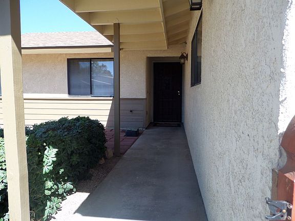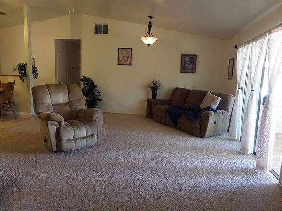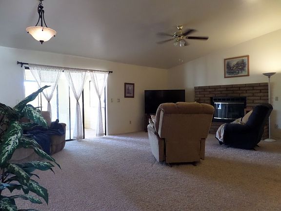 Picket fence encloses front yard. Outside trim recently painted. Tiled entry welcomes you to large great rm with textured cathedral ceiling; fireplace has mantle, hearth & gas! Enclosed patio for peaceful retreat. Breakfast bar opens to the kitchen w/pot shelf above.Nook w/fan & kitchen have tiled floors; refinished cabinets, mw, ss sealed burner range, dw.Continue down the hallway on new carpet to guest full bath w/new toilet & tiled floor.Two guest bedrms have fans.Linen cabinets in hall.Master suite also has fan, closet w/mirrored drs, slider to another patio!Mstr full bath has 2 sinks, tiled floor,& new toilet.3 outdoor patios to relax & enjoy the outdoors.Shed for storage or hobbies on the NE side of yard.South patio has shade cover.Garage has newer water heater & furnace w/humidifier, insulated garage dr w/opener, storage shelves, laundry area, sink & evap! A/C SEER 13 on ground; Mastercool on roof has new pads & motor.New roof 2015.Backyard has shade tree and some oleanders.