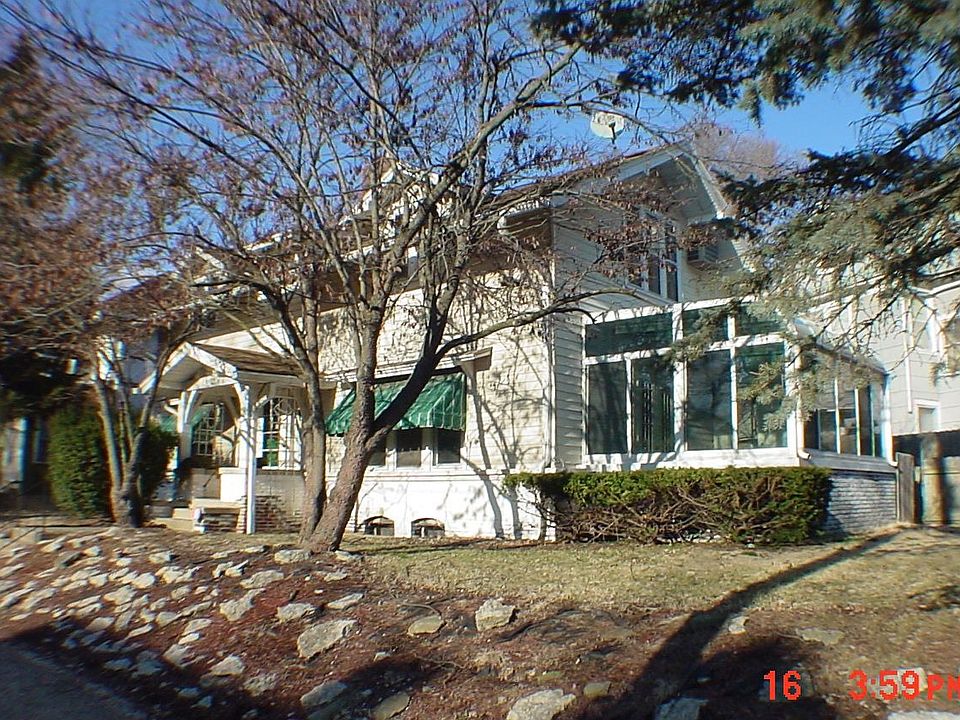 1901 prairie style residence on landscaped corner lot. Aluminum clad exterior retains elegant style and unique details such as roof dormers and sun room off living room. Built-in leaded glass hutch. Fireplace with built-in shelves. Living room has wood beam ceilings. Needs work but loaded with charm.