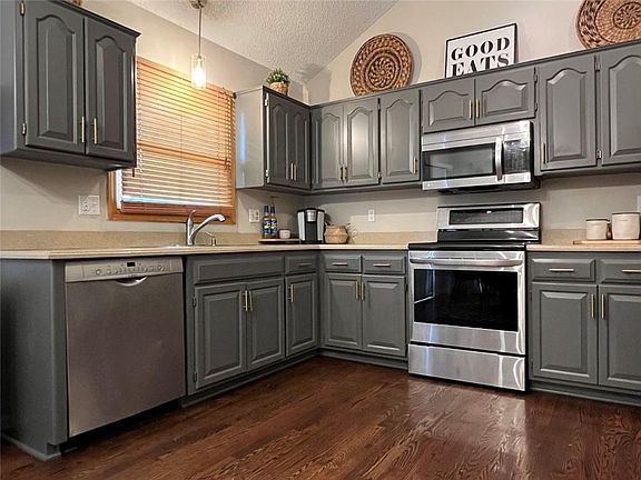 - Ceiling Fan(s), Kitchen Island, Painted Cabinets, Vaulted Ceiling(s)