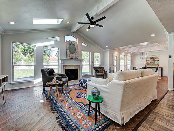 Beautifully renovated contemporary. Open concept with soaring vaulted ceiling. Wall of windows overlooking fenced back yard. Kitchen has new appliances, granite countertops, subway tile backsplash and breakfast bar. Living, dining and kitchen open to one another all with backyard views. 4 beds or 3 beds with an office. All beds have new carpet and generous closet space. Outstanding designer tile in remodeled master bath--huge walkin shower. This striking contemporary is outstanding.