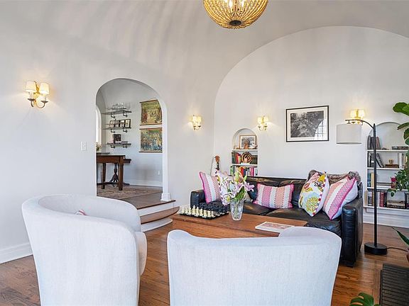 Step into the airy living room, where striking floor-to-ceiling windows and a soaring barrel ceiling flood the space with light. Up two steps and you’re in the open-plan dining area and kitchen, perfect for both entertaining and everyday living. Swing open the casement windows in the breakfast nook while you sip your morning coffee. The remodeled kitchen is a cook’s dream, and a spacious walk-in pantry completes the picture.