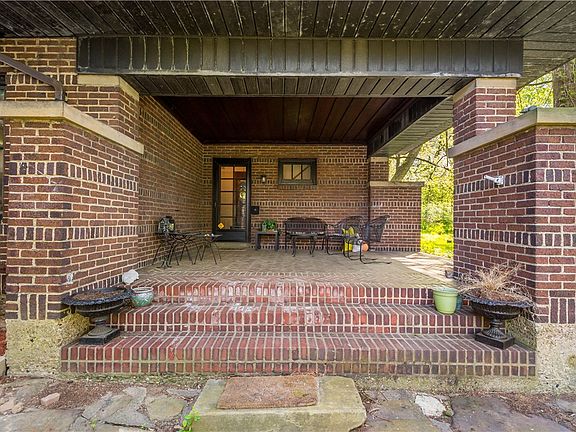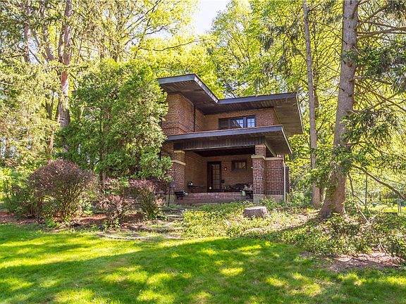 Classic Arts and Crafts Brick Bungalow situated on a large treed lot. Original Hardwood Trim, Built-ins, Hardware, Hardwood Floors throughout. Inviting Front Porch to enjoy the natural expansive grounds. Gas Fireplace in Living Room and Decorative Fireplace in Dining Room. Beautiful original carved staircase, with architectural drawings for the entire home included, along with addition and landscaping plans. Two large bedrooms upstairs, with a built in safe in the Main Bedroom closet, share a full bath. This floor also has an additional room to use as a den, office, library or as your imagination sees fit. Large 2 car detached garage with a long drive for additional parking. The metal roof has a 50 year warranty that will transfer to the new owner. This home would make FLW Proud.