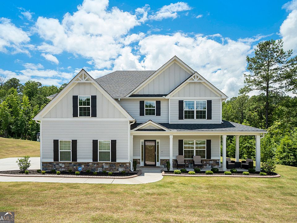 IMMACULATE executive home is located in the top ranked Northgate High School district in Coweta County. Acre lot at cul-de-sac. Rocking chair front porch wraps around to the side, and there's also a fantastic game day porch on the back, giving you options to enjoy outdoors regardless of where the sun may be throughout the day. Amazing interior layout offers the best of open concept and traditional space, with a formal dining room with coffered ceilings just off the foyer entry, and a chef's kitchen, large family room and secondary bedroom with bathroom on the main level. Outstanding features include engineered hardwood flooring on the main level (carpet in the bedroom), smooth ceilings, soothing neutral colors, recessed lighting, and lots of natural light from the energy-efficient low E windows. The kitchen has a large pantry, double ovens, and 42" white cabinetry for a sleek, timeless look. Stainless appliances, a lovely stainless vent hood, appealing glass subway tile backsplash, and pendant task lighting over the oversized worksurface island make the kitchen the heart of the home and the ideal spot for gathering with friends and loved ones. All appliances remain. The upstairs has 4 bedrooms, including the primary suite, and 2 additional bathrooms. Private en suite bath in primary has dual vanities, a soaking tub and a custom tile shower. All of the bedrooms are GENEROUSLY proportioned, with just the right balance between storage and open area. The garage has just been treated with an epoxy finish that helps keep the interior cleaner since the concrete does not leach dirt. The outside game day porch is covered and has a stacked stone fireplace, making it ideal for enjoying morning coffee or an evening glass of wine, just enjoying nature and seeing the occasional deer stroll by. SUPER easy commute to Atlanta Hartsfield Jackson airport or into the city, but far enough away to be peaceful and serene.