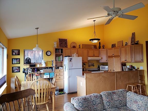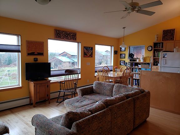 Beautiful, well-maintained two-bedroom home for sale in Ecovillage at Ithaca, a unique cohousing community in the Finger Lakes Region in New York State. Gorgeous views of the neighborhood, large pond, fields, and distant hills through large south-facing, passive solar windows. Great natural light, views, and an open floor plan. Top floor of an up/down duplex, shared yard with grape vines and fruit trees. In the center of the neighborhood but on the second floor for privacy and quiet. Two bedrooms with lofts in each (one 80 sq. ft. loft is used as a bedroom, the other 66 sq. ft. loft is used for storage), 1 full bath, hardwood oak floors throughout, Thomasville kitchen cabinets, private deck on second floor. Newly installed mini-split for air conditioning and back-up heating. Very low heat bills due to large south facing solar windows and second floor location (approximately $500/year). New washer and dryer. Close to parking, also includes a carport. All Ecovillage residents have access to 175 shared acres, including trails through the fields and woods; playgrounds; basketball court; swimming pond; organic farms; and adjacent land owned by Cornell Plantations, perfect for hiking, cross-country skiing, and snowshoeing. Common houses are available for the use of all, with dining areas, playrooms, sitting rooms/libraries, kitchens, guest rooms, pool and ping pong tables, and shared laundry facilities. Community dinners and other optional events are held during the week. Community is an important aspect of living at Ecovillage. In order to see if Ecovillage is a good fit, potential buyers are required to take a formal tour, visit for 5 days, participate in work-team activities, attend 2 community meetings, and meet with the Membership Committee, among other things. Interested parties must meet all Ecovillage membership requirements and be willing to contribute 2-4 hours a week to community work.