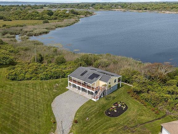 This home is located at the end of a private road, nestled amongst several other cottages. The residence is perfectly sited along the shoreline of Round Pond capturing beautiful views of the Pond and acres of conservation land. The home is a move-in ready residence in pristine condition. It offers an open floor plan with adaptable living spaces. It was recently upgraded with materials that are designed to withstand the saltwater climate. Many of its amenities include central air and solar panels, porches that expand both the east and west elevations provide additional entertaining and living space during the warmer summer months. The private setting is enhanced by multiple lots, mature coastal plantings, views over Long Pond, glimpses of the ocean, and a very short walk to ocean beaches. A rare offering in one of Sakonnet Point's most coveted, seaside neighborhoods. BUYER pays the Little Compton Agricultural Conservancy Tax at the recording of the deed.