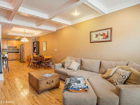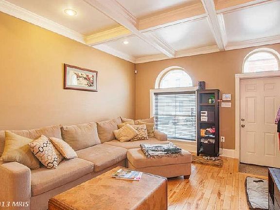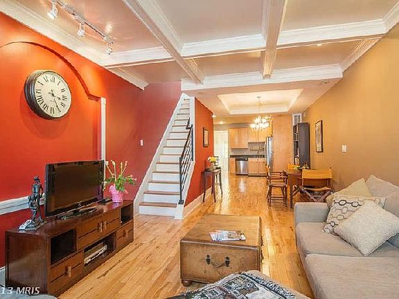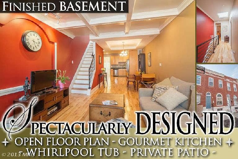 SPECTACULARLY DESIGNED PATTERSON PARK ROWHOME WITH OVER 1,400 SQ. FT. OF LIVING SPACE! Hw floors throughout, LR w/ coffered ceiling, dining area, Chef's kit w/ granite counters & ss appliances, main lvl half bath & laundry area, upper level w/ 2 large bedrooms w/ tall ceilings, hall bath w/ whirlpool tub & sep shower, fin basement w/ family room or 3rd bedroom & storage room, & private rear patio!