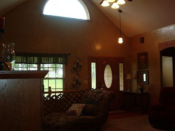 AWESOME HOME! 10'ceilings,textured walls, & faux paint finish in L.R. & kitchen. Cathedral ceiling in L.R. & 1 bdrm. L.R. has wood beam above kitchen & hall entrance. 6 oak base & 6 panel oak doors upstairs. kitchen has granite tile countertops,huge island w/ cooktop & prep sink, lots of oak cabinets. Master bath has 4'x 6' jetted tub, walk in shower,his/her closets. Basement has kitchen, 3 bdrms, w/d hookups, 33'x5'concrete storm shelter/ storage area. Covered front porch,back deck,& patio,above ground pool,white vinyl fenc, paved drive.