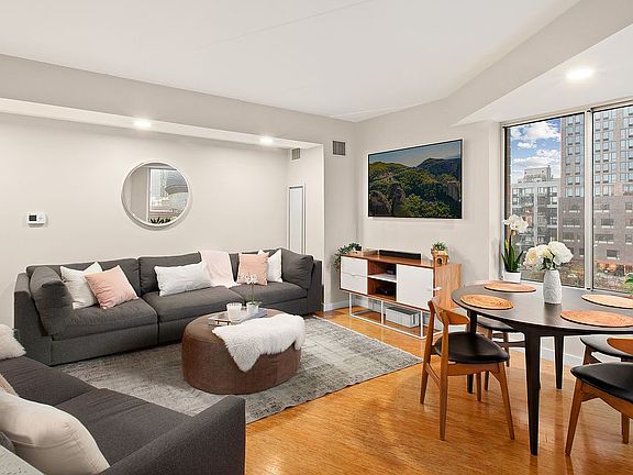 Remarkable value in Fort Greene. Welcome to Unit 5J, a bright, efficiently-designed corner unit at Atlantic Terrace, a ten-story, LEED-certified co-op building, sharing borders with lovely Prospect Heights, Clinton Hill, and Park Slope. This apartment has a split two-bedroom, two-bathroom layout with an updated modern kitchen and living space, washer/dryer, central air/heat, and closet space throughout. The calm, cozy living space is fed natural light and striking architectural city views from oversize, double-paned windows.