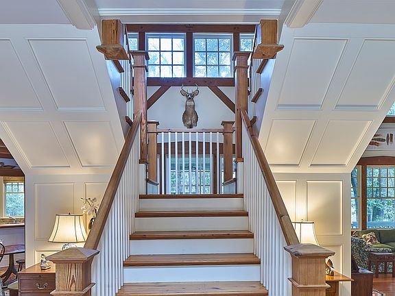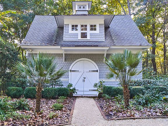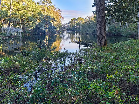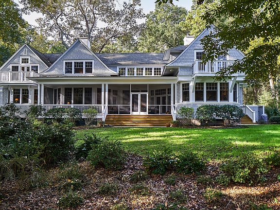 The home sits on a two plus acre property located on a secluded Rice Gate Pond. Looking down the pond, the marshes of Colleton River give off a distant glow. Birds, ducks, turtles, water birds and otters are some of the treats offered by this uniquely private setting. Surrounded by a mixed hard wood forest, there is true serenity any time of year and an endless fascination watching life on the pond. A suspenseful moment awaits you as you pull into the driveway. This classic shingle style house was designed by Thorndike Williams Jr., a renowned architect from Long Island’s north shore. Vaulted ceilings, massive beams and openness create a sense of spaciousness and warmth. Upon entering, the architectural strength of the entire interior hits one with surprise. From the front hall, the view up the staircase emphasizes the amazing height of the trees through the upper windows. The dominating staircase which separates the dining and living room exposes the angles walls that add “sizzle” to the design. In the living room the wood burning fireplace is surrounded by a custom heart pine mantel and cabinetry. The catwalk above cantilevers out over the angled fireplace wall. Structural beams reach high across the 25 foot ceiling. Doors open from the dining room and living room onto an expansive porch to make the outdoors a center stage for entertaining and plein air dinning. The dining room space is open to the kitchen. A small inglenook with a cozy fireplace and bookcases is tucked in next to the wet bar. This intimate little sitting area is a favorite place given the proximity to both the bar and the kitchen. Across, French doors open onto the porch to expand the dining room and bring in a beautiful view of the pond. The kitchen cabinetry, from Christians Kitchens, is made of wood from Loire Valley. Hardware is from France, counters are granite and the floor is Mexican tile. Top-notch appliances and ample counter space make cooking a breeze. A big pantry and huge storage closet add additional room for kitchen equipment. The downstairs master bedroom is paneled in natural cypress wood. Bookcases, cabinets and a fireplace also add warmth. The coffered ceiling is unique. The dressing room between the two master baths is unusually huge, allowing for an extensive wardrobe, a desk and more storage. Upstairs the three bedrooms and a multi-purpose room are separated by the catwalk. Hipped dormers or “jerkin heads” and granny attic ceilings define the rooms. Balconies in two of the rooms offer wonderful views of the water. The two car garage, disguised in the front as a stable, has a multi-purpose guest suite upstairs. A private bath, closet, and balcony complete the room. The floor is a mosaic design of a Mexican tile and heart pine that mimics the pattern in the front hall. Stay and enjoy this home any time of year. Love the extensive gardens and the sweet smell of gardenias by the entrance. Listen to nature’s music on the porch and be drawn to the pond’s incessant magic. Relish the privacy and surround yourself with wonderful friends who share in this remarkable Island.