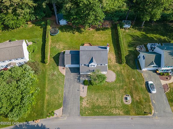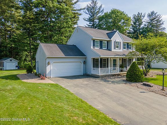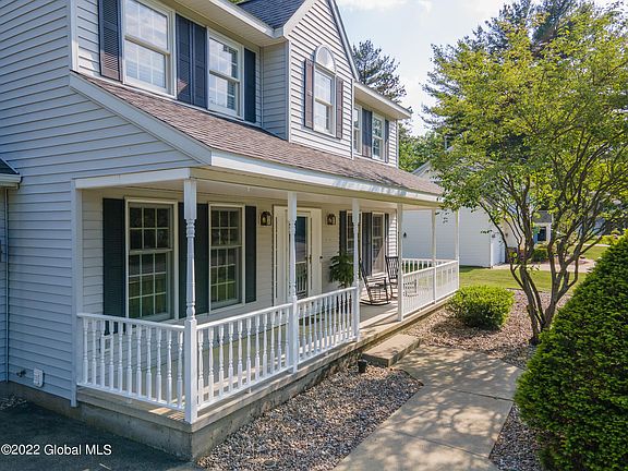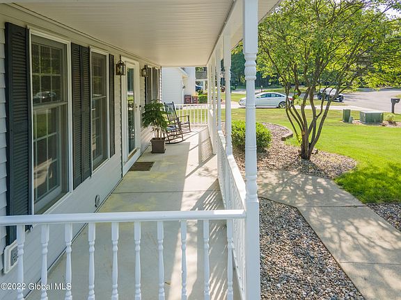 This beautiful colonial sits on a manicured yard on a quiet cul de sac street in the desirable Primrose Estates. You will get the ''welcome home'' feeling as you approach the house length front porch. Impressive refinished hardwood floors and fresh paint throughout. The eat in kitchen is open to the living room with wood fireplace. 1st floor also offers a formal dining room, den/office and updated half bath. 3 bedroom up. The primary BR offers a W/I closet, a double closet and en suite. Enjoy the, spacious, peaceful, level and private backyard from the sizable deck. Gas line for grill and wired for hot tub. Shed with garage door. IG sprinklers. Good portion of basement is sheet rocked. Roof (10), Central Air (2), Newer hot water heater. Serviced by the Guilderland School District.