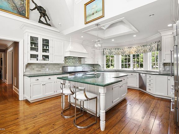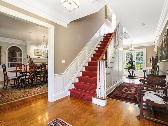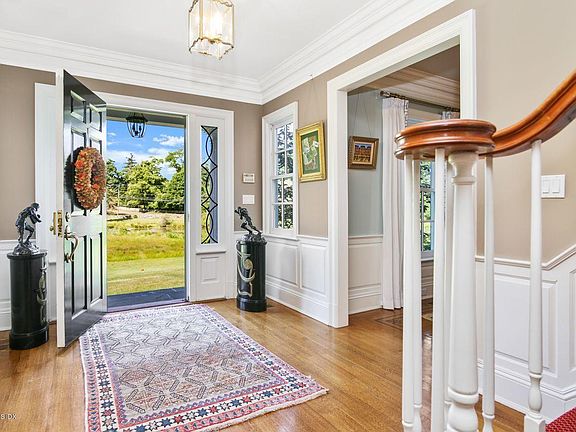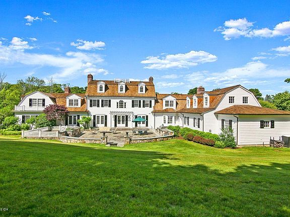 Picture-perfect Gambrel Colonial home on 4.39 magnificent acres with formal gardens, rolling lawns, a wildlife meadow, fountain-pond & pool-site; all set well back off a scenic road and long, sweeping driveway. Elegance in a front to back entry hall, gracious living room, formal dining room, library, family room; all with welcoming fireplace. Guest bath and wet bar offer elegant access to a grand terrace for entertaining. Natural light fills a wonderfully appointed gourmet kitchen with center island, double story breakfast room and outfitted mudroom. Sumptuous luxury includes a master or ideal guest suite on both floors plus three more private en-suites. Incredible craftsmanship featuring spacious office, game room, gymnasium. Close by private golf-tennis-swim clubs; 45 miles/NYC.