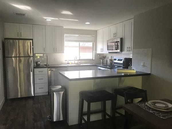 PRIME LOCATION Brand new remodel! Light and bright, open floor plan, and custom paint inside with white trim. Two bed, two bath apartment with washer and dryer in unit. Spacious bedrooms with plentiful closet space, big bright windows and new shutters. Kitchen/family room combo, all brand new stainless steel appliances, stone slab counters, new soft close cabinetry and a view out the kitchen window! Huge balcony were you can enjoy a BBQ or sit and relax. This unit is in the very front courtyard, so easy access to parking and walks to downtown. Has an amazing swimming pool for warm summer days and a dog run area next to the creek. PLEASE TEXT 949-293-5725 Move in by 3/25 and pay no deposit.