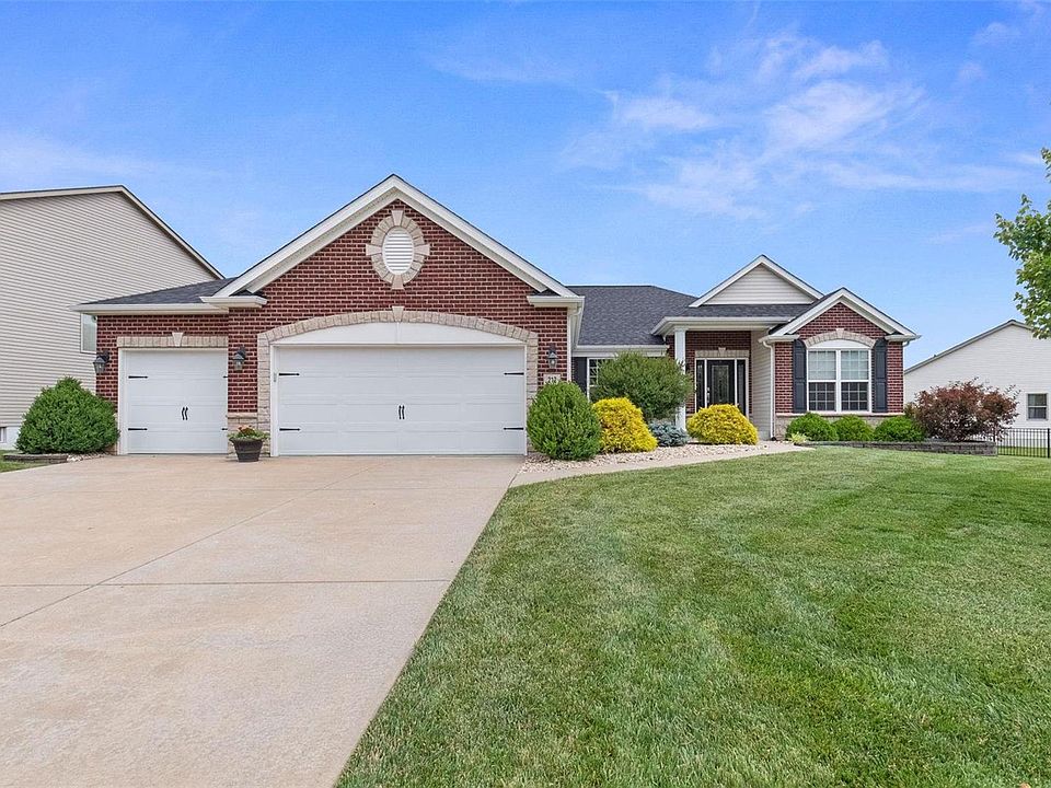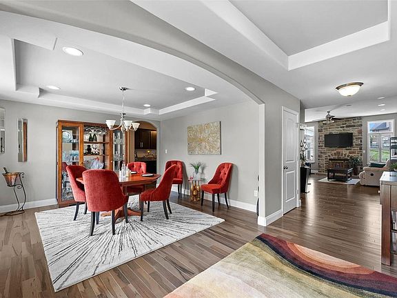 RANCH home w/3-CAR GARAGE. 10' ceilings, wood floors, tray ceiling, arch doorways, wood shutters,sprinkler system, finished LL, GAS fireplace. Kitchen island extended for seating, walk-in pantry w/sensor light, quartz countertops, tile backsplash. Formal dining room w/butler pantry makes serving from kitchen so easy! Mudroom off garage. BrkfstRm & hearth room open onto aggregate patio. Office area in front (Could be converted into bdrm if needed) 2 secondary bdrms, full hall bath. Divided bdrm floorplan puts Primary bdrm on other side of home, w/bay window, tray ceiling, ceiling fan & bathroom suite w/separate shower, corner tub, dual vanities, HUGE walk-in closet. MAIN FLOOR LAUNDRY off garage, w/coat closet.... and the incredible basement finish.GREAT for ENTERTAINING, caretaker/inlaw quarters.(wet bar, bedroom, full bath, rec room w/LOTS OF STORAGE!) Subdivision pool & elementary school within walking distance in subdivision! WENTZVILLE municipality. Additional Rooms: Sun Room