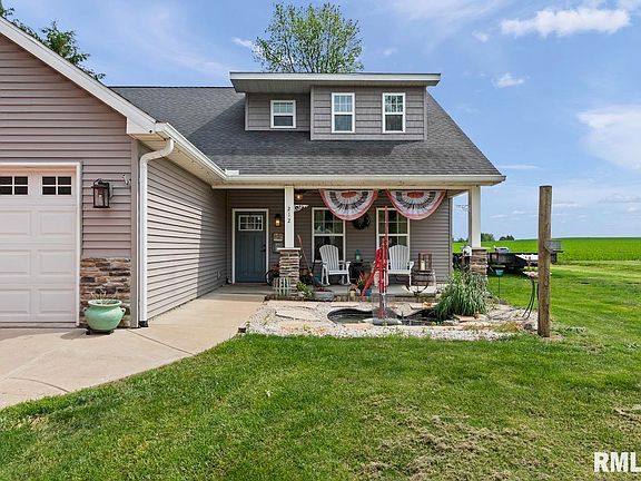 Step into this beautifully designed 1.5-story farmhouse-style retreat, where charm meets modern comfort. Boasting 3 spacious bedrooms and 2 full bathrooms, this home is filled with trendy yet timeless finishes. Cozy front porch with pond. You'll love the fresh, neutral paint tones that complement the shiplap accents and striking wooden ceiling beams. The open-concept kitchen is a showstopper with sleek quartz waterfall countertops, a cool tile backsplash, white cabinetry, pendant lighting over the breakfast bar, and newer stainless steel appliances. Enjoy the warmth of hydronic in-floor heating and appreciate thoughtful touches like sliding barn doors, a new water softener, and a tankless water heater. The stunning upstairs loft offers the perfect hangout space or bonus room for hobbies and relaxation. Both bathrooms feature stylish subway-tiled showers, and the main floor laundry adds convenience to daily life. Dunlap Schools close by along with walking trails. Out back, an expanded patio provides an ideal spot to entertain, while the private backyard backs up to a serene cornfield—your own quiet slice of country. And for added peace of mind, the oversized garage includes a fireproof protection room that doubles as a storm shelter. This one checks every box—style, function, and comfort all wrapped into one exceptional property. Schedule your appointment today!
