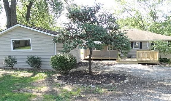 Remodeled inside and outside. 4 BR, 2 BA, Granite in kitchen, appliances all new. Gas range, dishwasher, refrigerator, micro in stainless and all match. 4x6 island has 3 sets of pull out drawers, pull out holding 2 trash containers, drawers, electricity, pendant lights above. Black granite sink. Luxury plank flooring throughout. Master BR has 2 sets of closets, custom closet doors, Both baths have solid surface counters, tiled walls in shower, jetted tub in one, lg. medicine cabinets & stool toppers. All new windows, trim, paint, doors, gravel paths, sidewalks around house, 6x21 covered front porch/Trek decking. 9x21 Covered back deck, 14x14 open air deck, 8x12 lawn bld., 21x23 garage/concrete floor-auto overhead door-walk-through door and finished inside walls. Vinyl siding matches house. Concrete driveway. New Central Heat, CA unit is almost new. Attic fan. House has been custom finished. Will not be disappointed.