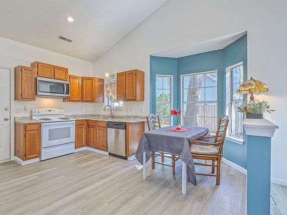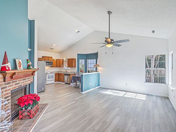 This centrally-located, 1-level, 3-bed/2-bath, open-plan home with vaulted ceilings, an eat-in kitchen and fully-fenced backyard is move-in ready, with new LVP flooring and fresh interior paint. Soft natural light fills the home from abundant windows, including an arched picture window in the living room and a bay window in the kitchen. The wood-burning fireplace in the family room helps create a cozy environment. The back deck and yard are accessed from a sunroom off the family room or from the well-sized primary suite, with a walk-in closet, ensuite with dual vanities, garden tub, separate shower and private water closet. The home boasts a laundry room with shelves, ceiling fans in most rooms and 3 separate attics for storage. Other recent improvements include a new microwave,...... new fixtures, hardware and electrical outlets, and relatively modern (3 to 5 year-old) HVAC and roof shingles. The washer and dryer convey as is. You'll love Braemoor's low annual HOA fees and location! It's close to a wide range of public amenities, places of worship, hospitals, shopping centers, major retailers and employers. Walk or ride to the new multi-use Central Creek Park (via a neighborhood path), South Berkeley Seniors Center, Berkeley County Library, Goose Creek Community Center and Amphitheater - all less than a mile away! Also nearby are the new Roper St. Francis Berkeley Hospital, Northwoods Mall, Crowfield Golf Club, Wannamaker Park and Charleston Southern University. Easy access to Highways 52, 78, I-26 and other major roads provide a short commute to Charleston International Airport and major employers like Naval Support Activity Charleston, Google Data Center Berkeley County, Mercedes Benz, Volvo, Boeing and Joint Base Charleston.