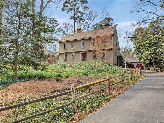 Superb Replica of a Pre -Revolutionary Saltbox from Deerfield, Massachusetts. Custom built by renowned high end builder Doug Woolfolk situated on a private almost 1 acre lot in the prestigious and desirable Westham neighborhood adjacent to University of Richmond. The home features intricate detailing throughout including reclaimed wide hardwood flooring and 250 year old reclaimed beams. The family room sports a large brick fireplace & a Raleigh Tavern Bar..There are 3 other fireplaces including one in the first floor En-suite Master and another in the formal dining room. Upstairs you will find 3 additional large Bedrooms and 2 full bathrooms. Some other highlights include a basement with workshop plus attached garage, detached 2 car garage which models the home (24 x 24), paved driveway, Cedar shake roof In great shape (recently inspected and treated), Whole house Generator, and split rail fencing.
