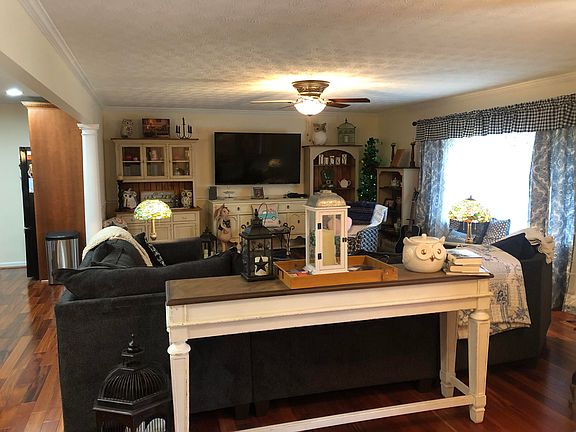 As soon as you enter through the front door, you're greeted by an open floor plan highlighted by stunning Brazilian tiger-striped hardwood flooring. Elegant columned transitions and crown molding add a touch of sophistication throughout. The well-appointed kitchen features a spacious island with granite countertops, a separate dining area, and a beautiful, mantled fireplace. It also offers plenty of built-in features, including shelving. Beyond the expansive living room, you'll find a cozy private den that opens to a screened-in patio. The home includes a master bedroom with an en-suite bath and two additional bedrooms, all conveniently located on a single level. An oversized two-car attached garage provides ample space. Situated in the desirable Valley Ridge Highlands. Garage door operators are smart phone compatible.