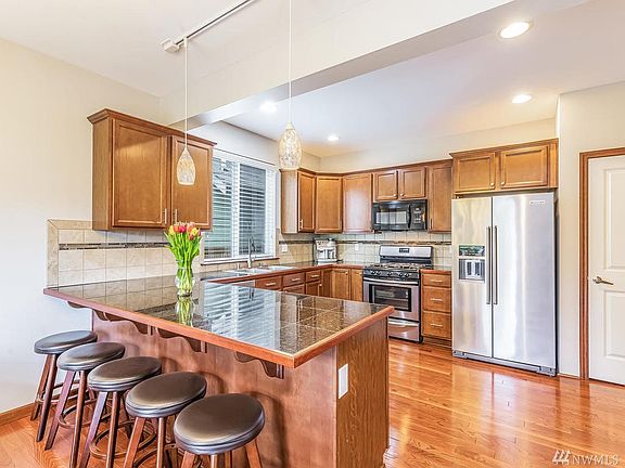 Central location nestled in a gated community! Granite tile kitchen counters, newer appliances incl gas range. Upstairs are 4 spacious bedrooms including the master en-suite with 5pc bath plus full bath & convenient laundry. Main floor den is perfect home office. Hardwoods on main & sun filled great room w/gas FP. Hi-eff furnace plus HP mini-split. Heated garage, lots of guest parking and fully fenced backyard. Walk to the New Lake Stickney park. Mins to shopping, restaurants, Boeing & freeways.