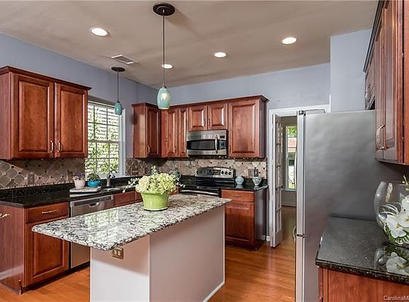 Home is priced well below appraised value. Highly sought after Cuthbertson middle and high schools.Low maintenance exterior lends itself to outdoor entertainment with sunroom,two decks and a patio overlooking a private rear yard with white picket fence.Upper deck has retractable awning.Lawn maintenance is included with HOA,landscapers will not come inside of the fence. Open floor plan family room adjoins eat in kitchen and dining room/study option.Master BR & 2nd BR with bath on main level with a bonus master/bath on second level with den/playroom attached.Tons of storage and added shelving in all closets. All bedrooms have walk-in closets.The private upstairs is perfect for downsizers that need a guest suite or place for other guests. Many upgrades to include hardwood flooring & granite countertops. HVAC replaced in 2019. Beautifully maintained by original owner. Neighborhood amenities include clubhouse with fitness center, two pools,playground & tennis courts Five minutes to Waxhaw