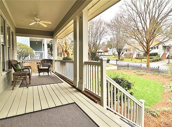 This home can be mistaken for a model home plus superior curb appeal located on tree-lined street. Welcoming front porch with breezes from overhead fan. Enter into foyer then large, open living / dining room with built-ins around a wood-burning fireplace. Columns subtly divide without a barrier. Note the desk-nook which can be returned to a closet if desired. Eat-in kitchen is bright with bay windows overlooking landscaped yard and has white cabinets, granite and Jenn-Air range (gas cooktop/electric convection oven) with warming drawer. Door to screened deck/porch with custom vinyl panels making this space usable most of the year (not insulated but HVAC extended). Rear bedroom currently used as a cozy den with french doors to enclosed porch. Secondary bedroom and full bath also on main. Owners expanded roof line to create a study / suite area adjoining upper level master and secondary bedroom. Double vanity in bath and jetted tub. Note the ample walk-in storage / attic.
