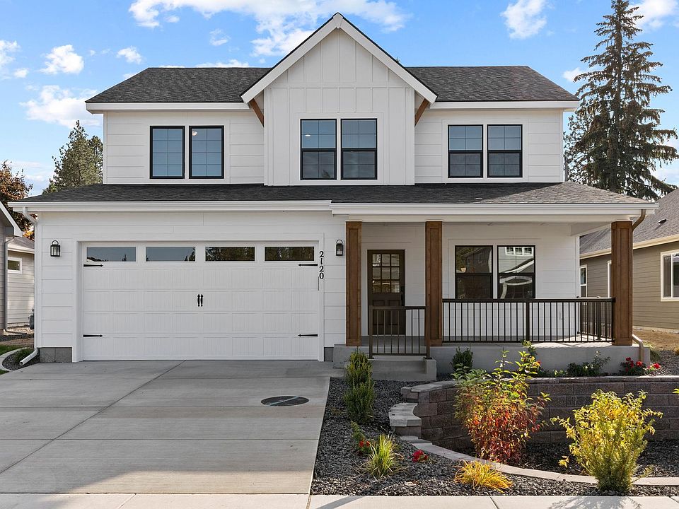 The Juniper is a farmhouse-themed, two-story home with an oversized two-car garage, an open concept main floor, a gourmet kitchen with pantry, island, and mud room, and an office/den. The second floor includes a master suite with a large walk-in closet, two secondary bedrooms, a spacious laundry room and a loft. This home is just at the final detail stage and will be complete and move in ready in 30 days. photos are of another Juniper