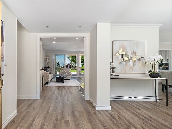Step through wide double doors and find beautiful beveled glass windows throughout along with luxury vinyl flooring, upgraded baseboards, crown molding, and a thoughtful layout featuring two oversized sliding glass doors that provide seamless indoor-outdoor flow to the covered patio, ideal for enjoying sunsets, city lights, views of Catalina Island, and cool ocean breezes.