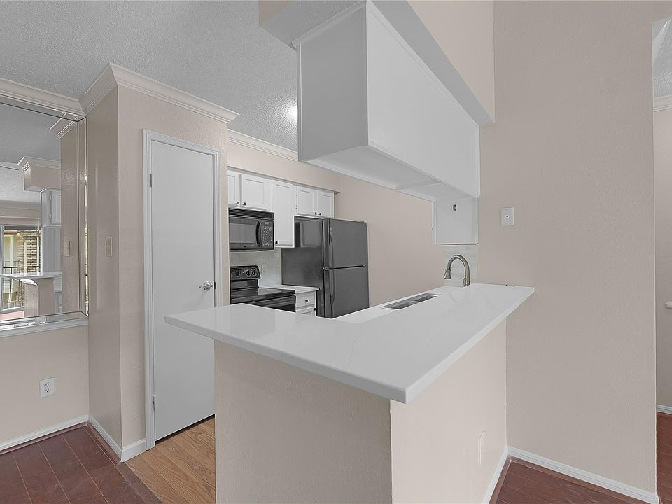 LOCATION at it's best if you are looking to be near Medical Center, Downtown, Meyerland and Galleria. Clean and ready for move in. 2 Bedroom/ 1 bath upstairs unit tucked in a quiet gated community with assigned parking spot. New quartz counter tops, bathroom vanity, walk in shower, vaulted ceilings, built-ins, balcony and BONUS comes with a full size washer/ dryer. HOA covers gate access, water, trash, cable, pool and exterior insurance.
