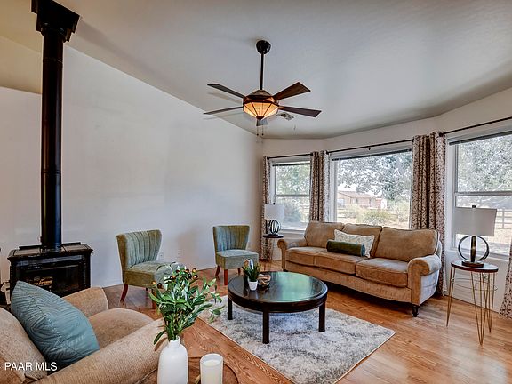 Privately Gated! Best Priced single family home on over 2 acres in Chino, Paulden or Prescott Valley & close in with only around 1,000 ft of dirt road is all!!! Oversized 2 car garage, 3 sheds for storage. A true gardeners paradise with over 50 trees, Peach, apple, cherry and pomegranate tree! BRAND NEW ROOF JULY 2024! A/C & Heater is a high efficiency Dual fuel replaced in 2015! Granite counter tops wood burning stove for cheap heat! Newer appliances with a smooth top electric stove, but with gas stub behind if you want a gas stove! 4 spacious bedrooms, master with large walk in closet and bath with sep shower and tub with dual sinks. Fenced back yard for pets, but don't miss the rest of the lot behind and to the side of the fenced back yard. Perfect for HUGE SHOP! Great WELL!