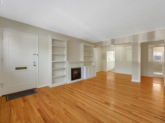 Light and bright, this inviting ground-level condo features beautiful hardwood floors, custom wood shutters, stylish built-ins around a cozy fireplace, and a well-designed kitchen for cooking with ample storage space. This immaculate unit offers two generous bedrooms and one bathroom, with the guest bedroom cleverly designed to include a Murphy Bed and additional storage for optimal use of space. Living room is massive with separate formal dining area. In-unit laundry hookups, too! Additional perks include deeded parking, dedicated storage, shared laundry facilities, and convenient bike parking in the basement. Dues include heat and hot water, plus most utilities and maintenance of the exterior and grounds. Fantastic location on the side of the building (not on the busy street), with easy access to Broadway shops and restaurants, New Seasons, Rose Quarter and downtown within minutes. Discover the best of inner NE Portland!