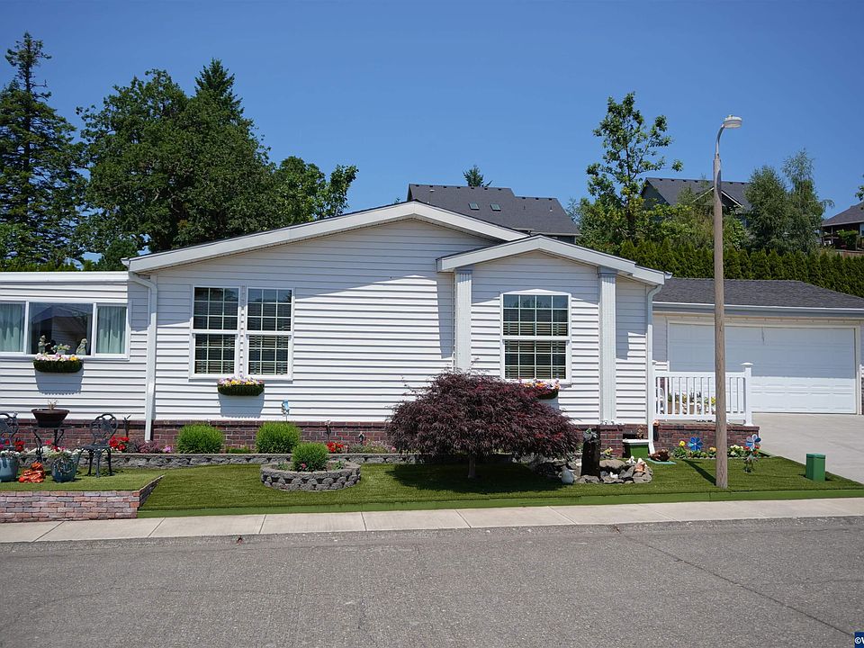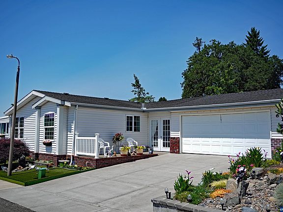 Premier 55+ MH park in Salem. Located at the top of the hill, this immaculately maintained home has full landscaping and 2 car garage. Great flow from kitchen to dining to living room. Primary bedroom at other end of home with attached bath and walk in closet. Recently updated plumbing, screens installed over gutters, new flooring on back patio, and new driveway/sidewalk. Interior painted in 2021. Large covered deck.