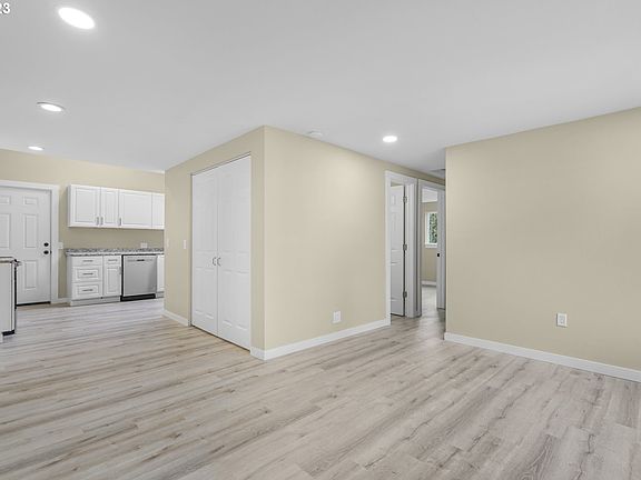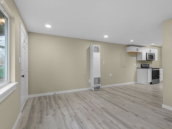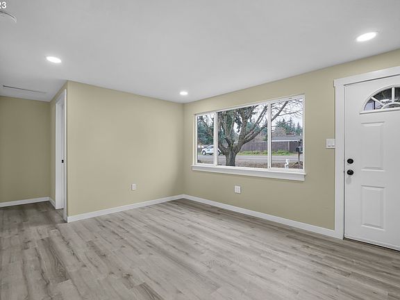 Adorable, fully remodeled 2-bedroom, 1-bath home is a delightful blend of comfort and style. Step inside to discover beautiful flooring throughout, creating a warm and inviting atmosphere. The living room has a large picture window, filling the space with natural light and providing a perfect spot to relax and unwind. The kitchen has a vaulted ceiling, skylight, all new cabinets, countertops, appliances and a deep sink. The bathroom is updated and there's also a designated laundry space. Step outside to the large fenced backyard, complete with a patio and mature shade trees, creating an ideal setting for outdoor gatherings. There's room for RV parking, and the garage offers additional storage space for your convenience and has a new garage door. This home is perfectly located, providing easy access to parks, schools, restaurants, the Kelly Butte Natural Area, and I-205.