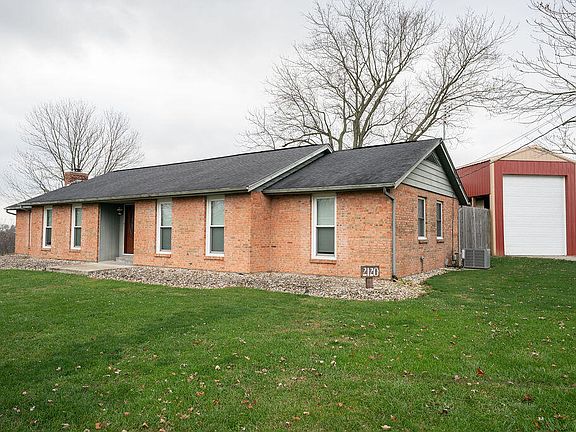 Panoramic country views and private back yard perfect for entertaining. This 3 bed, 2 full bath, all brick ranch sits on over 1.5 acres. This home has a large 2 car detached garage, a lawn equipment storage garage with roll up door, and a pole barn with full RV hook-ups incl. propane & septic. (48x16x16 with 12x14 door) The back yard features a covered patio, covered deck with lighting and ceiling fan and a 6' x 6' custom made fire pit making room for all you friends and family to gather around. The unfinished, full walkout basement is awaiting your finishing touch (57x26). All basement window wells have drains that feed into the installed french drain in the basement with two sump pumps for your peace of mind. New insulation in 2019, new Hot water heater in 2020, Septic system expanded in 2022, and new HVAC in 2023.