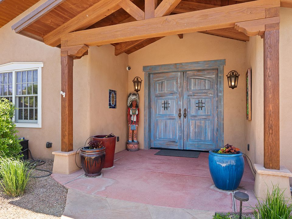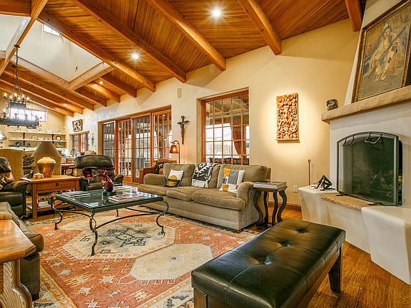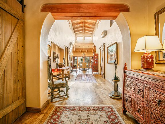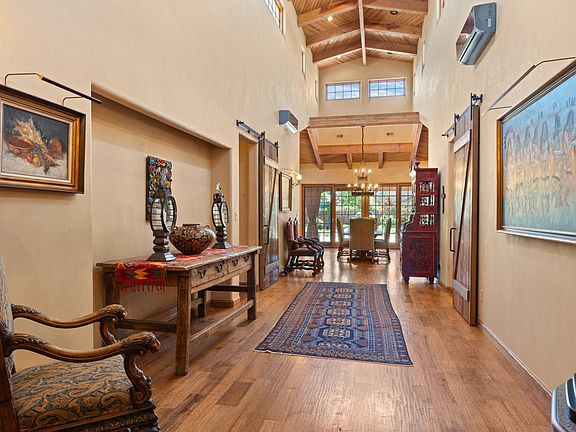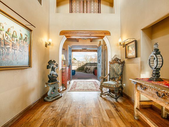 Dream New Mexican home in verdant North Valley. Enjoy the lifestyle this home offers. Spacious single level living, hickory floors, high ceilings with cedar latillas, plastered walls, and top of the line appointments. From the beautifully landscaped courtyard, enter the home through a light filled gallery to the large great room with a wall of windows overlooking the easy care landscaped patio/yard. The living area includes a gas log fireplace. The dining area in the center of the great room opens to the covered patio for year round indoor/outdoor entertaining. The high end kitchen has sandstone counter tops, custom cabinetry, Viking cobalt blue double ovens, and large butlers pantry with 2nd dishwasher, sink, and storage. Primary suite offers respite overlooking private garden.