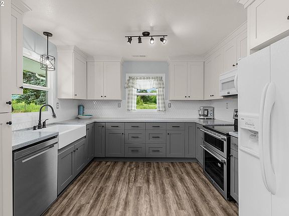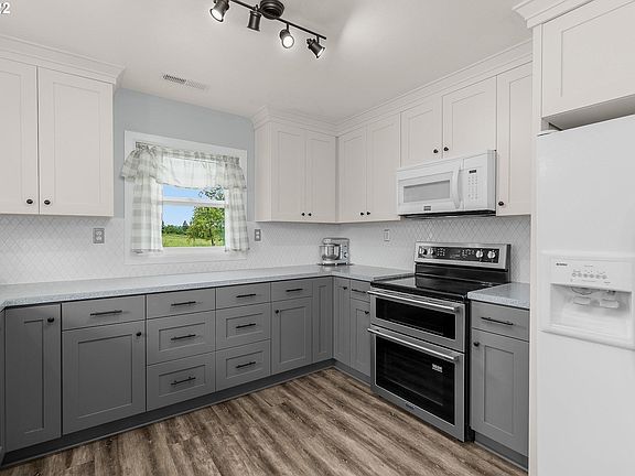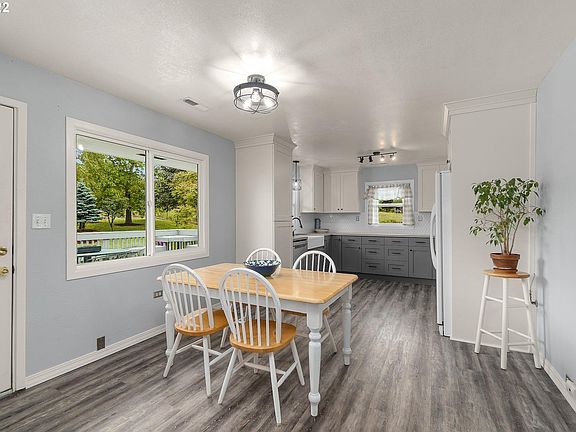 Close to town 9.69 acre Horse Farm with views of Chehalem Mountain! Land features horse pastures, 7-stall horse barn, 2-stall barn, and large workshop with 3 30 amp RV hookups. Kitchen updated in 2021 with custom cabinets, soft-close drawers, farmhouse sink, tile backsplash, corian edged counters, and LVP flooring throughout main level. Brick wood burning fireplace in spacious living room. 1,352 sq ft unfinished basement with endless potential! Extensive deck backing to quiet hazelnut orchard!