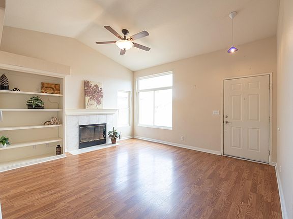 The living room is thoughtfully designed with built-in shelving offering a solution that allows for you to personalize and organize your living space.