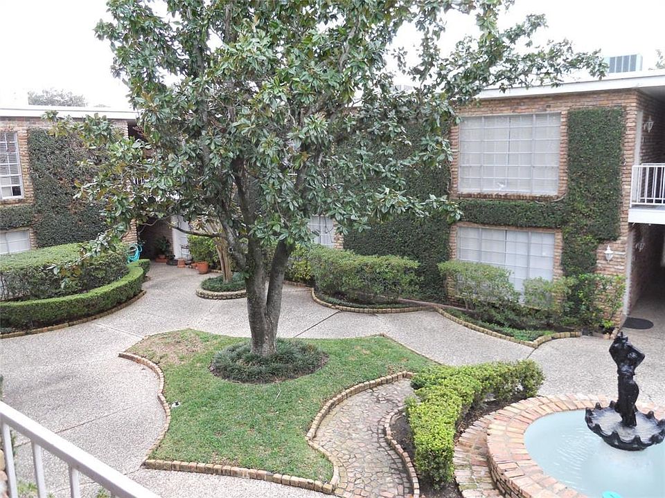 AWESOME: Updated 1/1 upper level Condo, a community with gated entry, picturesque view of lovely Courtyard with Fountain, well maintained grounds with 3 pools. Wood flooring in living/dining rooms, tile in kitchen/bath, carpet in large master bedr, with a clg fan for cool comfort, 2 walk in closets, a linen closet in bath. The living room has a large picture window with blinds letting in natural light, a clg fan & hardwood flooring. All utilities are included in rent. Great Location: near HEB, shopping, Banks, Gas Stations, Memorial/Post Oak Parks, YMCA, Bus stop, minutes to Galleria, down town & major freeways. One covered parking space and plenty of guest parking available.