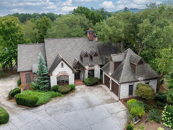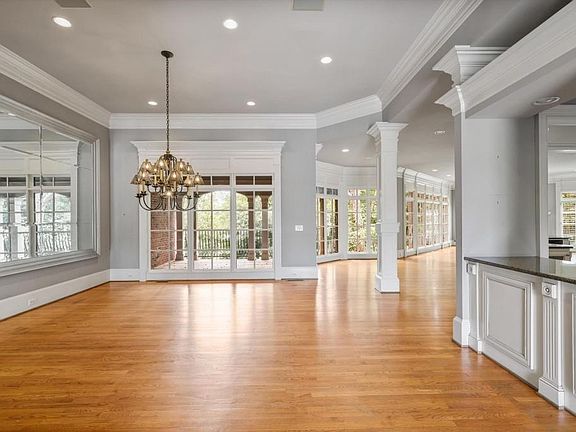 Sunlight streams through the ample oversized windows in this gorgeous European styled ranch on a full finished basement. Set in a curated community of 14 homes, the house sits at the end of the cul-de-sac where the fenced backyard offers privacy. There are beautiful views of a neighboring lake off the two rear covered porches, one with Italian-style wrought iron railing. The exterior, a mix of stone, brick, and custom wooden arches is charming from front to back. Inside a welcoming brick floored foyer, along with a custom framed mirrored wall dining room, feature 12' ceilings. The open family room, living room, and bedrooms have 10' ceilings. A spacious kitchen has a large Breakfast bar, white cabinets, stone countertops, two walk-in pantries, and desk. The butler's pantry/bar off the kitchen is perfect for entertaining. The inviting family room features a stacked stone fireplace, built in cabinets, and a beautifully appointed wall of windows. A separate formal living room would also serve as a wonderful music room. The primary suite is located on the main level and has access to the rear covered porch. It also features a large en suite primary bathroom with double vanities, soaking tub, separate shower and impressive walk-in closet. A laundry room is conveniently located off the kitchen, as is a covered walkway leading to the 2 car garage. Two additional bedrooms (one which would make a great office), a full bathroom, and half bath complete the main floor. An open staircase leads to a terrace level that features a second full kitchen with white cabinets, a second generous family room with brick floor, stacked stone fireplace, and wall of windows, Two bedrooms, both with private bathrooms, two large storage rooms, and the 3rd garage. This is the perfect home for anyone looking for something unique but extremely livable. The gated community is close to Marietta Country Club, Mount Paran and surrounding schools, Barrett Parkway, I-75, area restaurants and shopping!