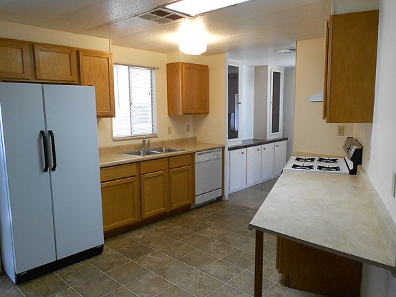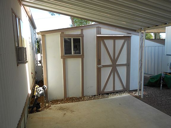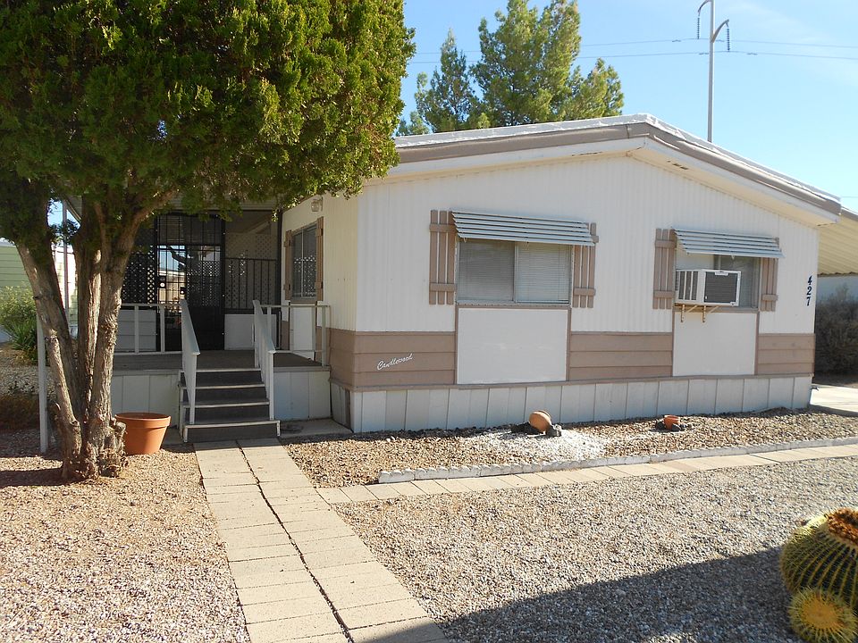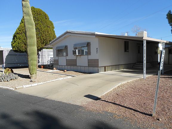 A perfect home for snowbirds or retirees. Located in one of Tucson's best 55+ parks. 2 lg bdrms + 2 baths. Dining room w/ built-in hutch, extra large family or bonus room, giant covered and screened patio, 2 extra patio decks, master suite has 2 separate closets and a garden tub. Lots of closets and huge storage shed. Large lot w/ fruit trees. Entire unit was replumbed. Roof newly coated. Appliances include: fridge, washer/dryer, dishwasher, gas stove. 3 Energy saving window air conditioning units less than 1 year old, gives temperature control of each room in house and saves $$$. Must qualify with park for space rental. Park amenities: Pet friendly. Larger dogs OK. Dog park. Lg sparkling pool, jacuzzi, sauna, exercise room, shuffleboard, and many daily and weekly activities, games, and classes. Home is in good condition. Opportunity to personalize it. Sold "As is." Tucson real estate prices are on the rise. Lot rent is $545 monthly. Hurry! This one won't last! Owner will consider financing at 0% interest with $4,000 down.